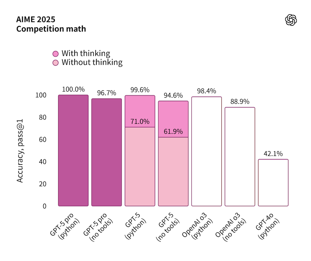 - 数学・論理思考:AIME(米国数学コンテスト)でGPT-5のツールなしでは94.6%、GPT-5 Proのツールありでは100%の正解