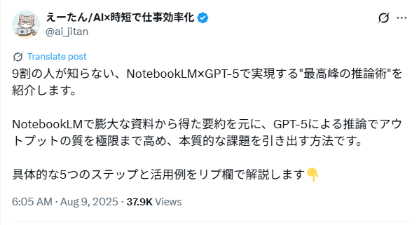 - 他AIと掛け合わせた事例「NotebookLMで得た資料要約を基に、GPT-5の推論で本質的な課題を引き出す」