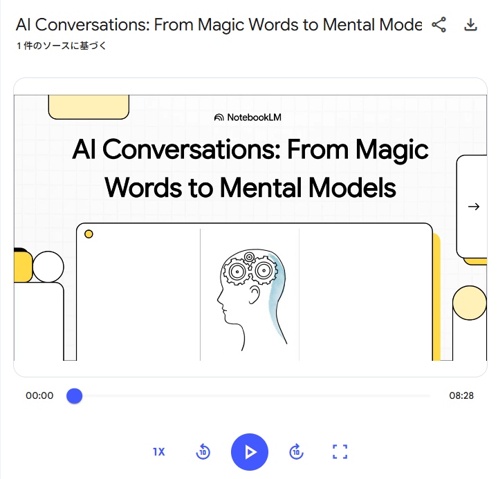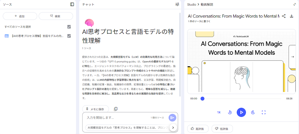 前述の通り、NotebookLMの動画解説は日本語に対応していませんが、生成される動画解説はわかりやすく感じ、その手軽さとクオリティに驚きました。