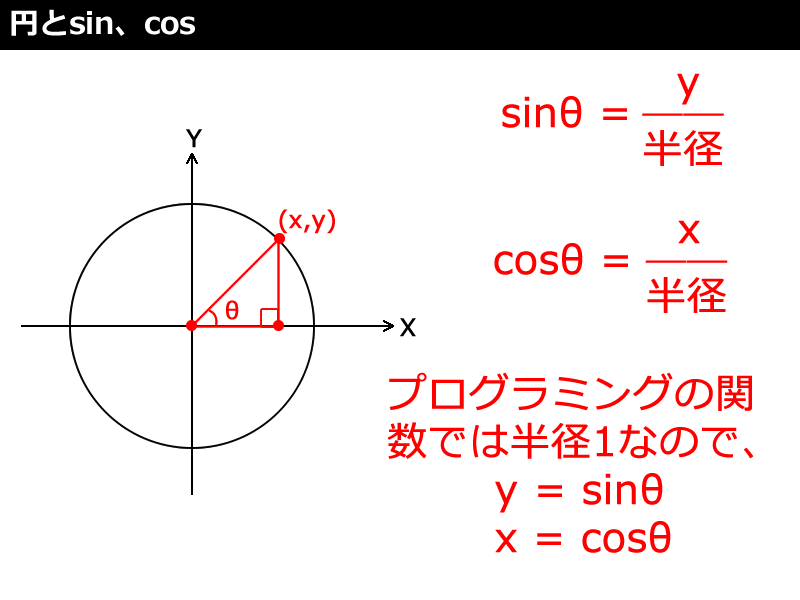 言うまでもなく図6のようにMath.sin(ラジアン)で「サイン」の数値を取得でき、Math.cos(ラジアン)で「コサイン」の数値を取得できます。ただ、大抵のプログラミング言語では「半径=1」としてsin、cosの値が取得できます。