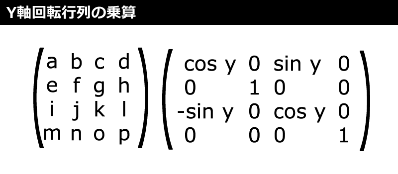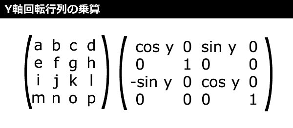 Y軸を中心に回転する行列の計算方法は、図7のように次のサンプルコードの「rotateY」メソッドの通りです。頂点のポイント自体が回転するわけではなく、Y軸を中心に頂点の位置が回転するわけです。これも行列同士を乗算して計算します。