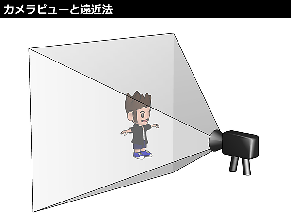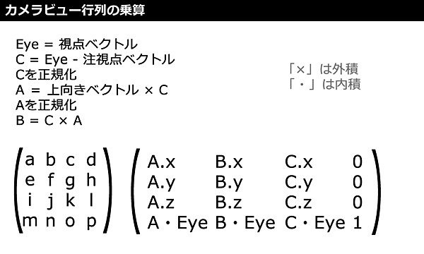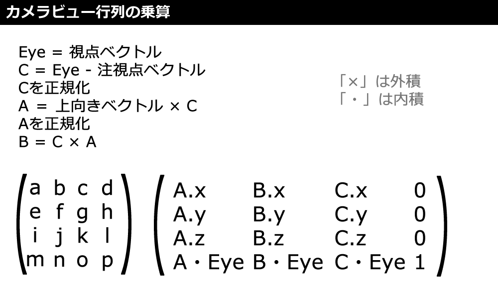 「ビュー」はカメラの「視点」と「注視点」と「上向きベクトル」を元に、カメラを3Dモデルなどに向ける行列です。カメラ視点はカメラの目の位置、カメラ注視点はカメラがどの座標に向いているか、上向きベクトルはカメラ自体の傾きです。