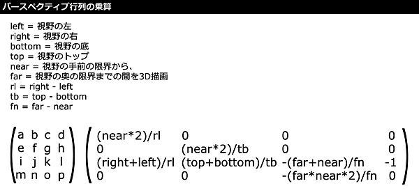 ・サンプルコード「lib」→「Matrix3D.js」 perspective(fov, aspect, near, far) {