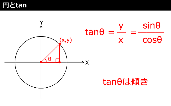 図12の「top」「bottom」「right」「left」は、次のサンプルコードのように計算します。「fov」引数は「視野角」、「aspect」引数は「アスペクト比(縦横比)」を「near(近く)」~「far(遠く)」の間まで3D描画します。基本的なことですが、図13のように「Math.tan(ラジアン)」の「タンジェント」についても解説します。