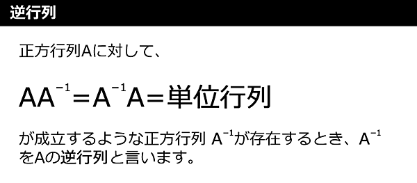 「逆行列」は図14のような行列式が成り立つ行列のことです。ある行列に逆行列を乗算すると単位行列になります。「inverse」は「逆数」「逆の」を意味する英語です。計算方法は次のサンプルコードの通りです。