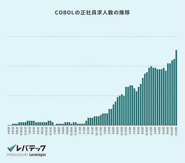 実際に「COBOL」の正社員求人数は直近2年で求人数が約2倍になっています(2024年12月時点)。「2025年の崖」が社会問題となるなかで、レガシーなシステムのマイグレーションやモダナイゼーションの需要がここ数年で高まっています。こうしたなかで、現状のCOBOLのシステムを読み解くことができる人を求めているケースも少なくありません。
