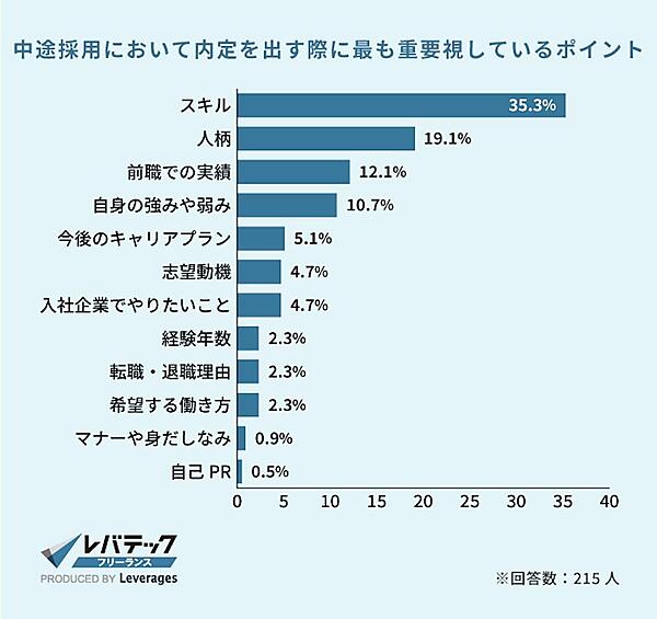 中途採用においては即戦力を求める企業が多く、キャリアチェンジ希望者の採用を実施している企業でも枠が少ないのが実情です。実際に中途採用において内定を出す際に最重視しているポイントは「スキル(35.3%)」が1位となるなど、入社後「即戦力となり得るか」という点が重視されているのが分かります。