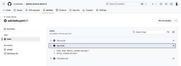 run: echo "Hello, GitHub Actions!"この例では、mainブランチへのpushをトリガーに「Hello, GitHub Actions!」を出力するだけのシンプルなジョブが実行されます。