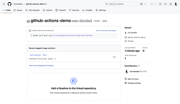 成功すると、リポジトリのPackagesタブにコンテナイメージが表示されます。