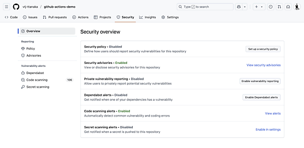 labels: ${{ steps.meta.outputs.labels }}ワークフローが成功すると、Securityタブにコンテナのセキュリティ情報がアップロードされます。
