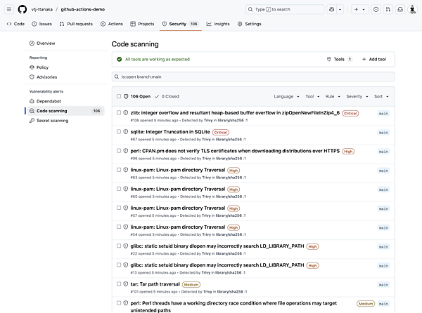 スキャン結果はGitHubのSecurityタブに表示され、脆弱性の詳細を確認できます。