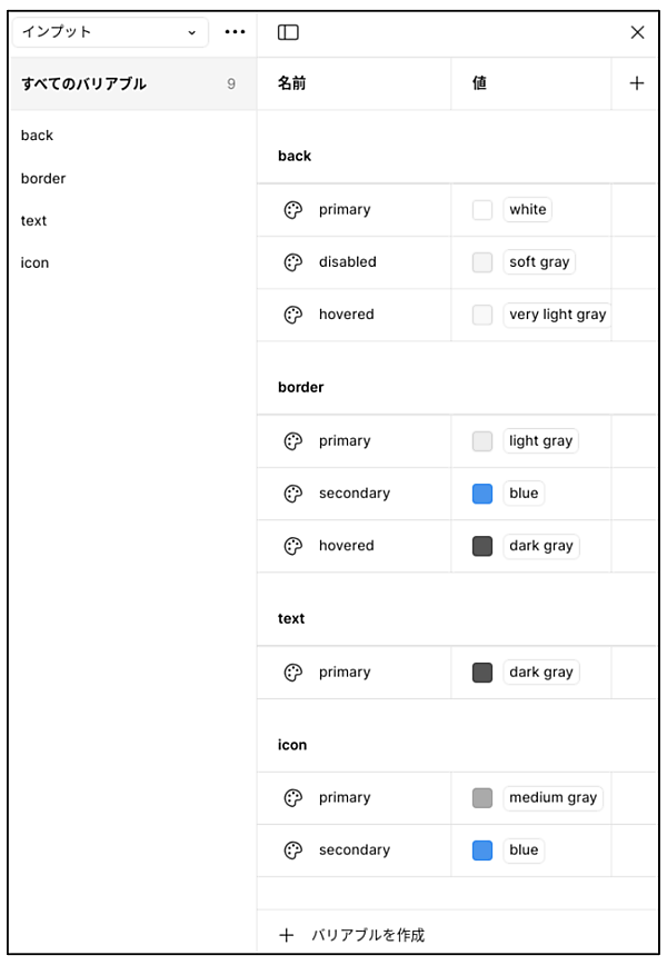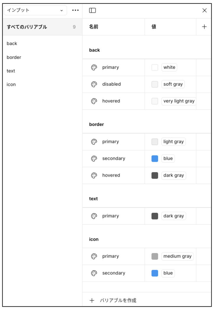 本連載では、ボタンなどのUI要素の種類ごとにコレクションを作る方針としています。テキストボックス用のコレクション「インプット」を追加して、図1のようなカラーバリアブルを作成します。