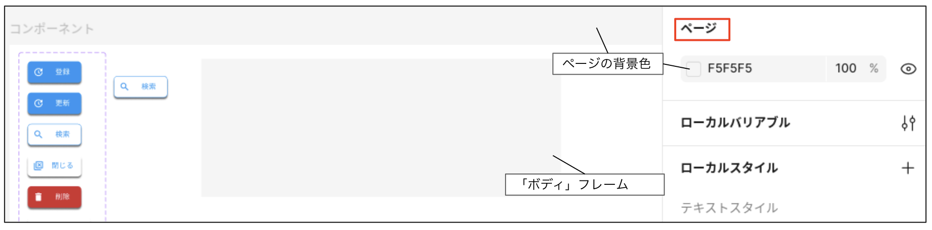 をクリックし、白い「コンポーネント」キャンバスの上に図3左のように#F5F5F5の「ボディ」フレームを作ってください。この上でテキストボックスを作っていきます。