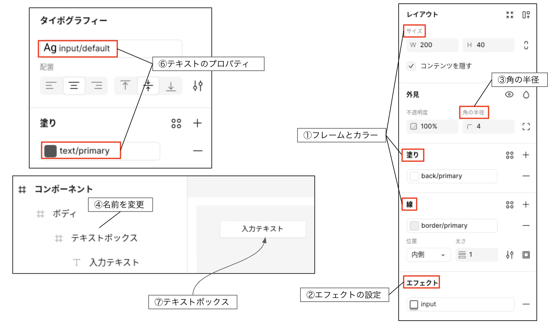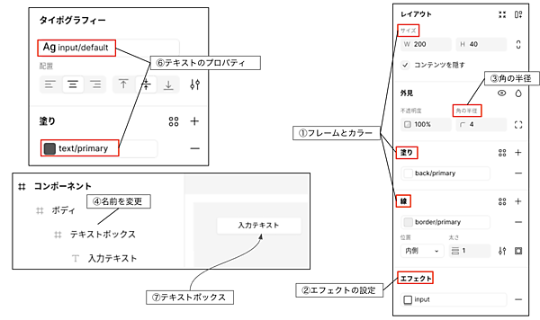 をクリックして、「ボディ」フレームの上に200W×40Hのテキストボックス用のフレームを作成してください。塗りは「インプット」コレクションから「back/primary」を選択し、線は「border/primary」を指定します(図4)。
