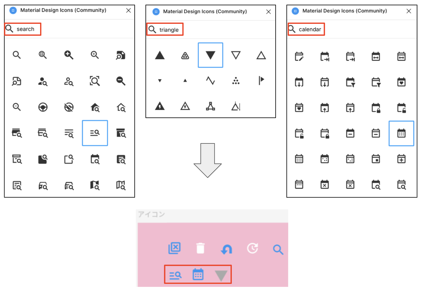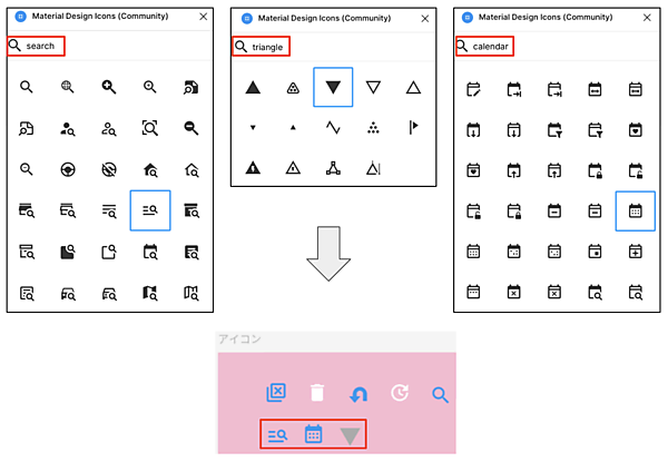 インプットで使用するアイコンを入手しましょう。今回必要なのはテキストボックスのピッカーですが、ついでにセレクタと日付入力ボックスのピッカーアイコンもゲットします。今回もまたプラグイン「Material Design Icons」の中から検索しましょう。