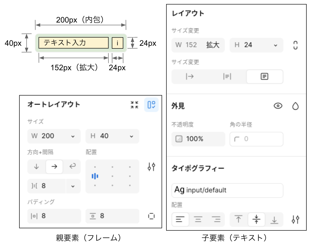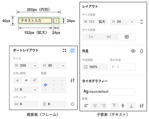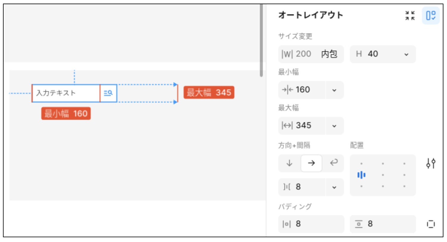 オートレイアウトを設定した際に、サイズは自動的に164W(内包)×40H(内包)に変わっています。これを200W(固定)×40H(固定)に戻してください。 - 左右の間隔とパディング