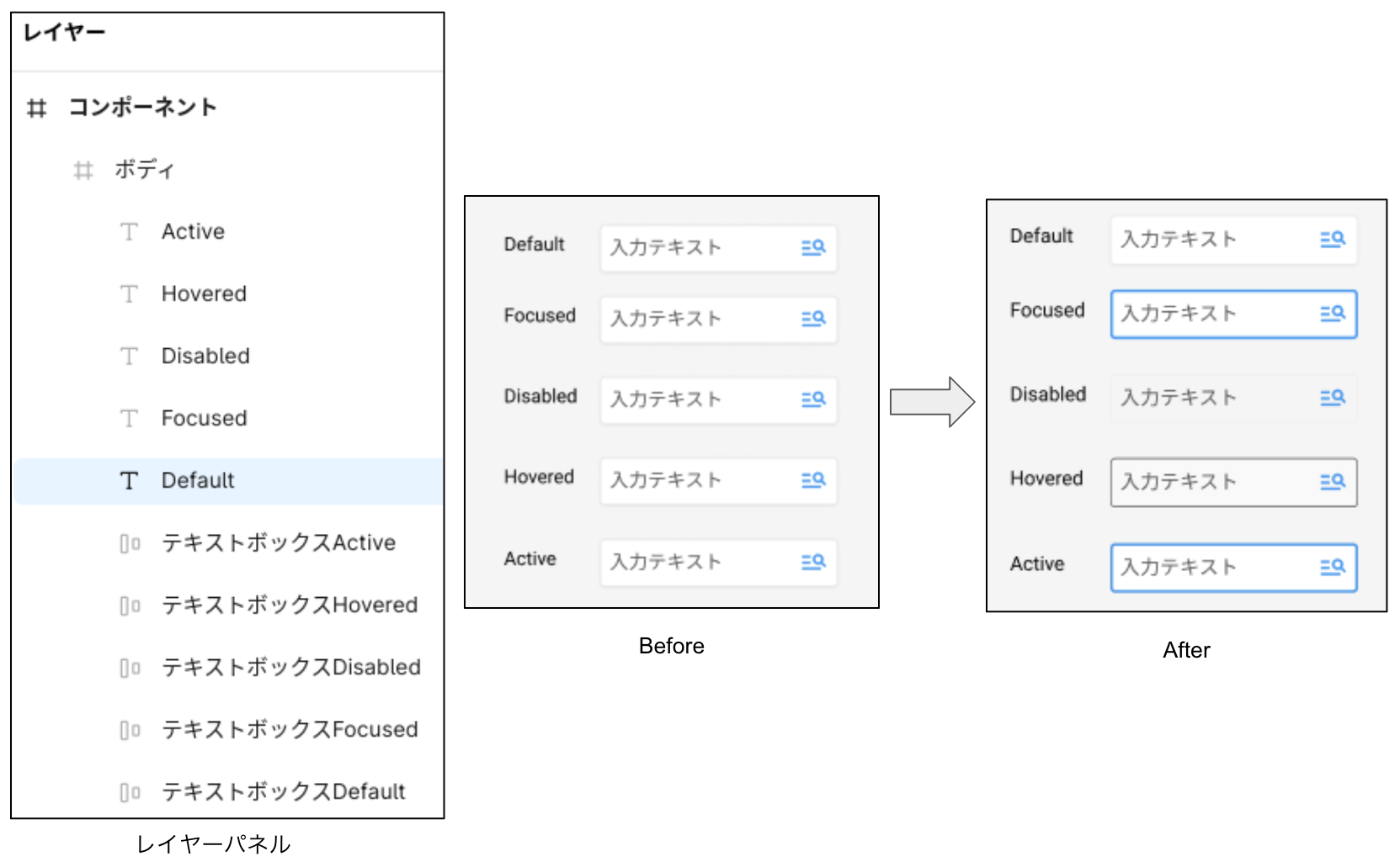 | 状態 | Default | Focused | Disabled | Hovered | Active |