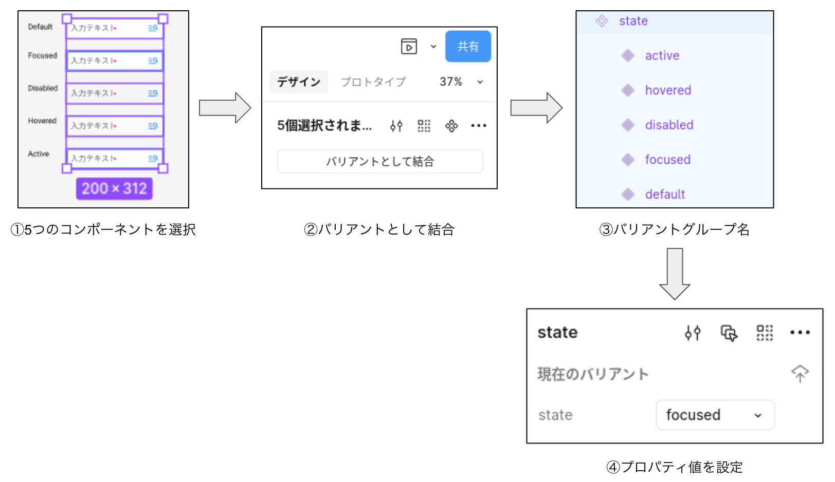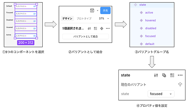 テキストボックスをコンポーネントにして、5つのバリアントとしてまとめましょう。個別に作成されたUI要素をあとからバリアントする際は次のような手順となります。