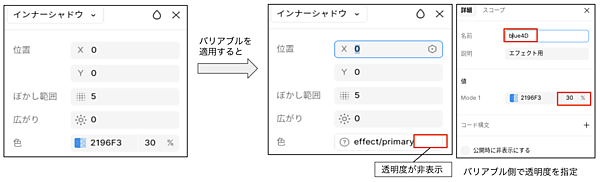 - Figmaのエフェクトスタイルでカラーバリアブルを指定する場合は、透明度別にカラーバリアブルを作成しておく必要がある