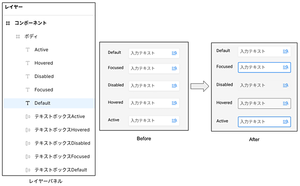 - デザインのステートとしてはDefault、Focused、Disable、Hovered、Activeなどのモードがある