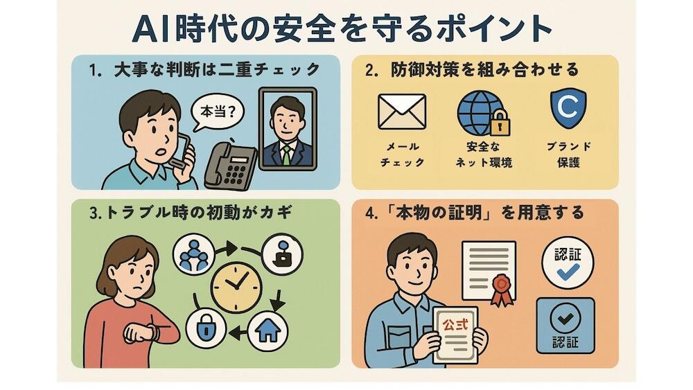 お金や重要な権限が動く場面では、どれほど自然な音声・映像でも別の方法での本人確認をお勧めします。社内電話帳の直通番号への折り返し確認や、担当者2名によるダブルチェックと待機時間を作業手順に組み込むことが有効で、「その場では決めない権限設計」が最後の砦となります。