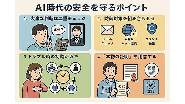 AIが攻撃の規模と巧妙さを高めている現状を踏まえ、複数の防御策を重ね合わせることが重要です。メール認証技術の導入、安全なインターネット閲覧環境、ブランド保護などを組み合わせます。従業員教育も「不自然な日本語を探す」から「取引内容の異常さで判断する」へと方針転換が必要です。フィッシング詐欺は話の流れや状況の不自然さで見極める段階に入りました。