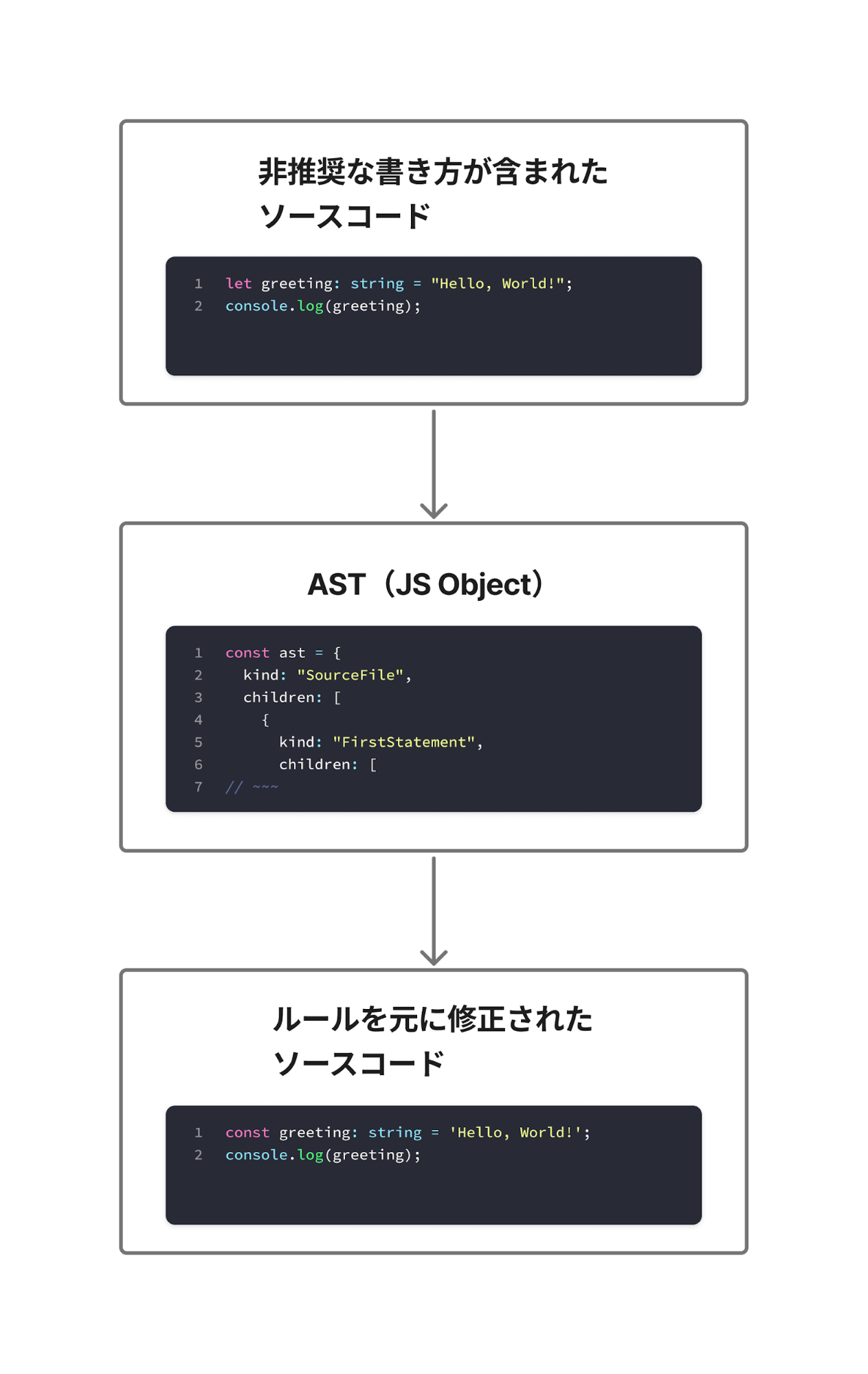 今回は、ASTからTypeScriptのソースコードを生成します。この生成の仕組みを利用し、前回開発したLinterをFormatterとして使えるようにします。