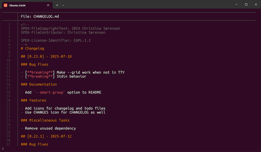 「bat」はcatの代替コマンドです。キーワードに色を付けるシンタックスハイライトやGit統合といった機能を持っています。