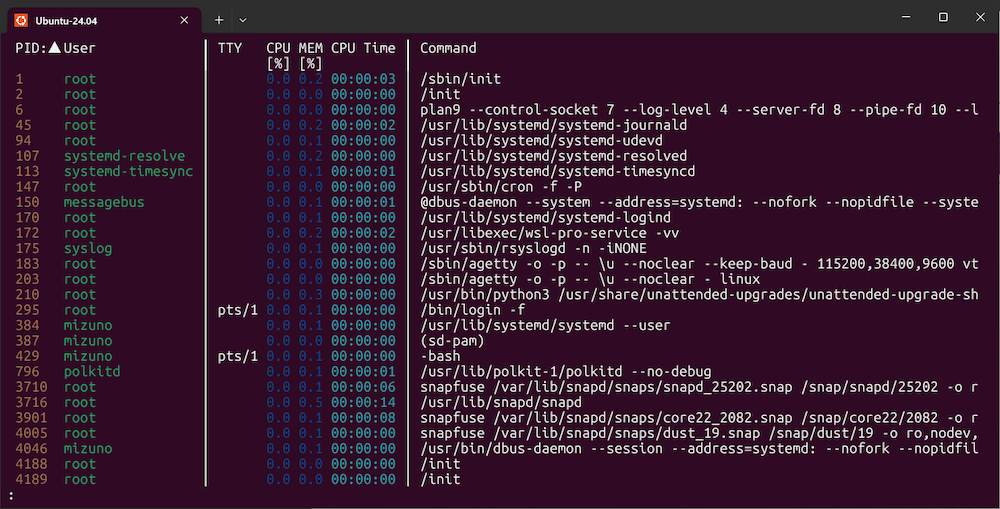 procsコマンドを実行すると現在実行中のプロセスリストが表示がされます。また、前述のbatコマンドと同様にprocsもデフォルトでページャを使って結果を表示します。