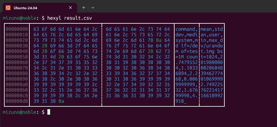 「hexyl」はhexdumpの代替コマンドです。バイナリダンプをカラフルで見やすく表示できます。
