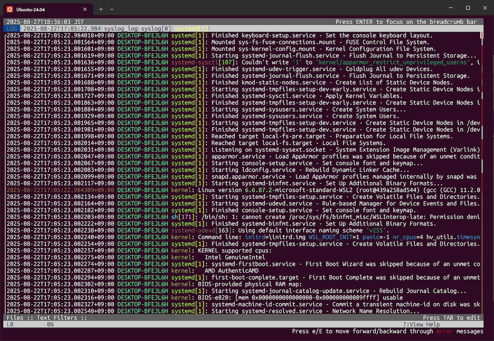 lnavコマンドを引数なしで実行するとsyslogファイルを開きます。このあたりがcat/batコマンドなどとは異なり、特化したログビューアであることの証左だと言えるでしょう。複数のログファイルを同時に表示したり、ディレクトリ内のすべてのログをまとめて開くこともできます。特別なオプションを付けなくても、ログが更新されると自動的に更新部分を読み込みます。