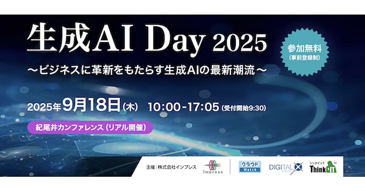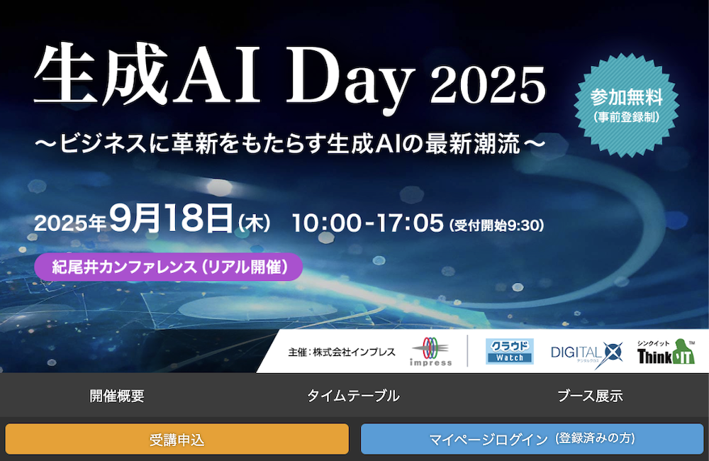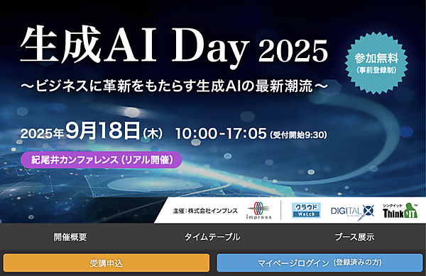 Think IT編集部は、クラウドWatch編集部およびDIGITAL X編集部と共同で「生成AI Day 2025」を2025年9月18日(木)に開催する。