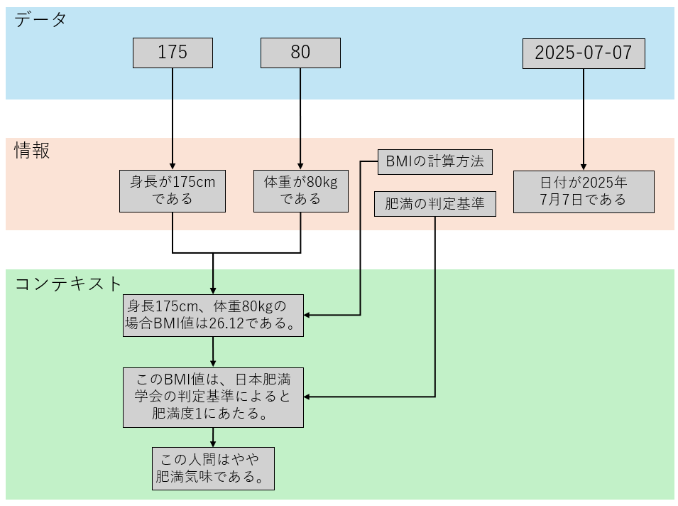 このデータに「意味」や「解釈」が付随すると、データは「情報」に変わります。例えば、“80”というデータが「体重が80kgである」ことを示すという解釈、“2025-07-07”というデータが「“-”は年/月/日の区切りを意味し、現在の日付が2025年7月7日である」ことを示すという解釈が加わることで、データを「情報」として扱うことができるようになります。