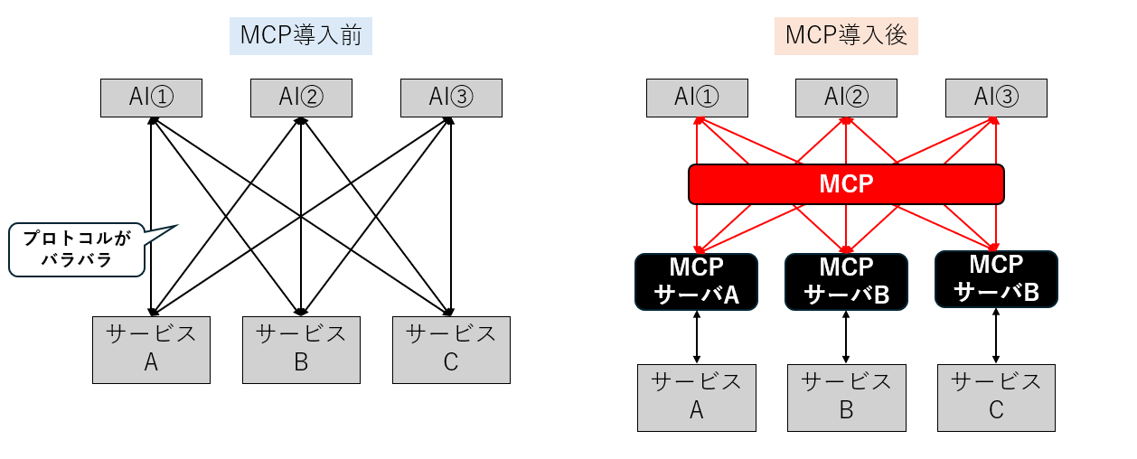AIは様々な外部ツールやサービスと連携することで、多岐にわたる作業を実行できます。しかし、前述したコンテキストの構造がツールやサービスごとにバラバラだと、連携の開発や運用に手間がかかります。