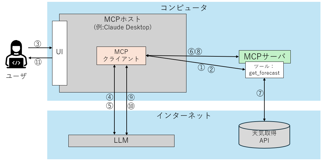 - LLMはレスポンスの内容を踏まえてユーザへの最終的な応答メッセージを生成し、MCPクライアントに送る。