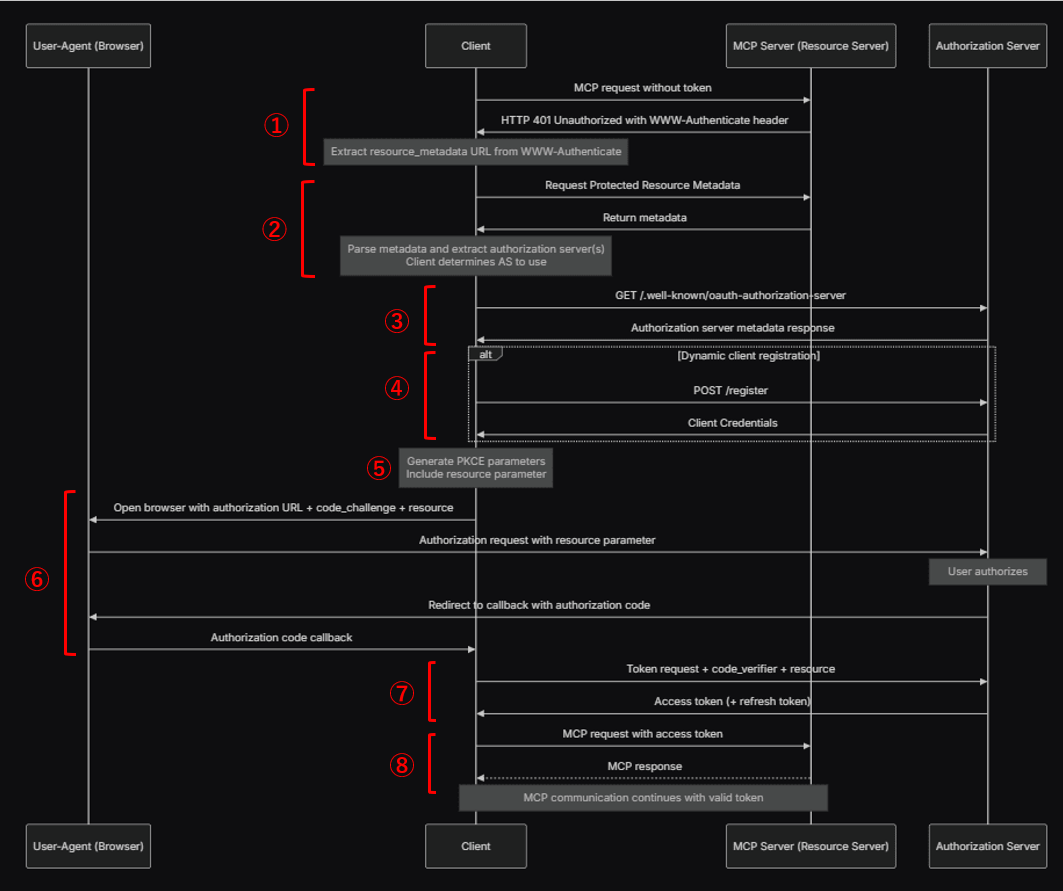このときMCPサーバは「401 Unauthorized」を返すが、RFC9728に基づいてWWW-Authenticateヘッダを使用し、リソースメタデータ(そのデータ自身についての付加的なデータ)のURLをMCPクライアントに通知する。このリソースメタデータには少なくとも1つの認可サーバのフィールドが含まれる。 - MCPクライアントは取得したURLからリソースメタデータの取得をリクエストし、取得したメタデータから使用する認可サーバを決定する。