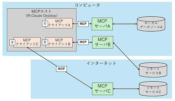 - MCPクライアント:MCPホストの内部に組み込まれているコネクタ(中継役)。各MCPサーバと1対に接続している