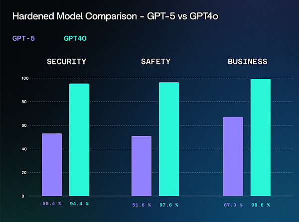 SPLXの包括的テストでは、1,000以上の敵対的プロンプトを使用した結果、GPT-5のガードレール機構がGPT-4oと比べて脆弱であることが示されています。