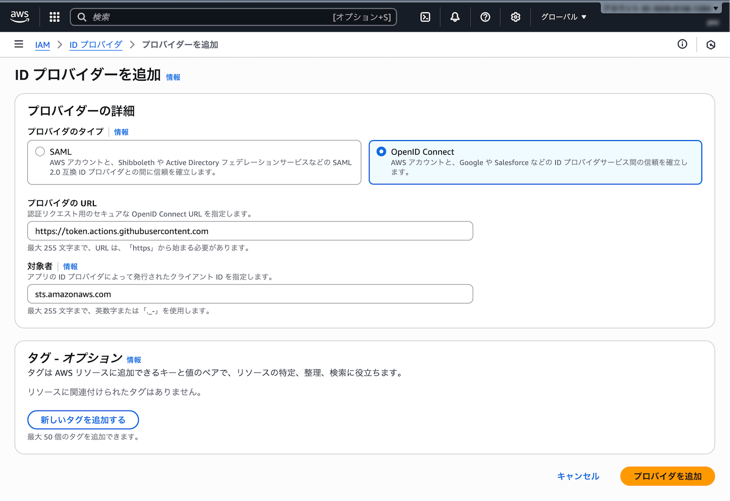 まず、AWSに「GitHubを信頼できる身分証明書の発行元(IDプロバイダー)ですよ」と教えてあげる必要があります。この設定は一度だけ行います。