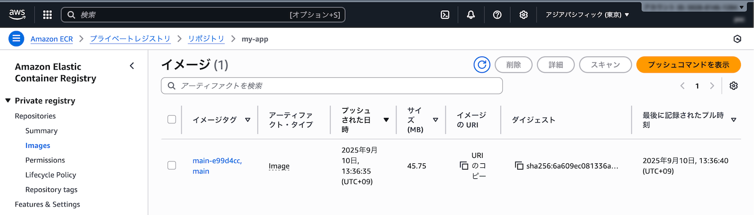AWS ECRコンソールで、プッシュされたイメージを確認できます。