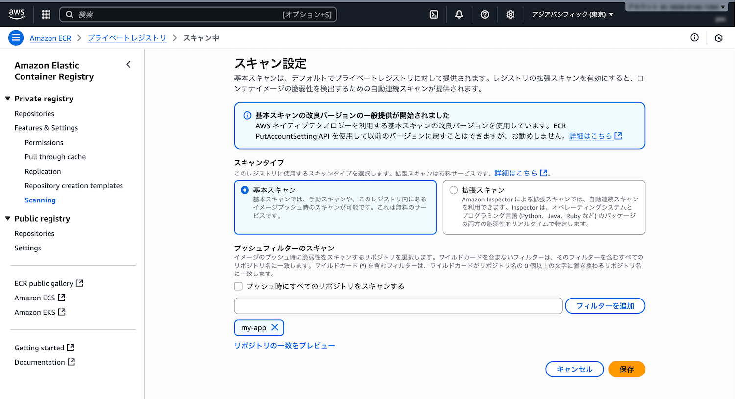 ECRには、コンテナイメージの脆弱性をスキャンする機能が組み込まれており、「基本スキャン」と「拡張スキャン」の2種類から選択できます。