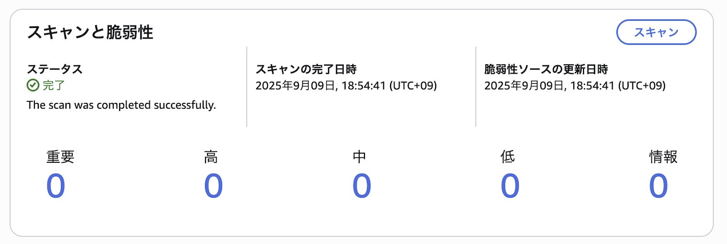 設定後、再度GitHub Actionsを実行し、コンテナイメージをプッシュするとコンテナイメージにスキャンが実行されます。実行結果を確認するには、リポジトリ(my-app)> 最新のイメージと進み、スキャンと脆弱性を確認してみてください。スキャンのステータス、スキャンの完了日時を見ると自動スキャンが実行されたことが分かります。