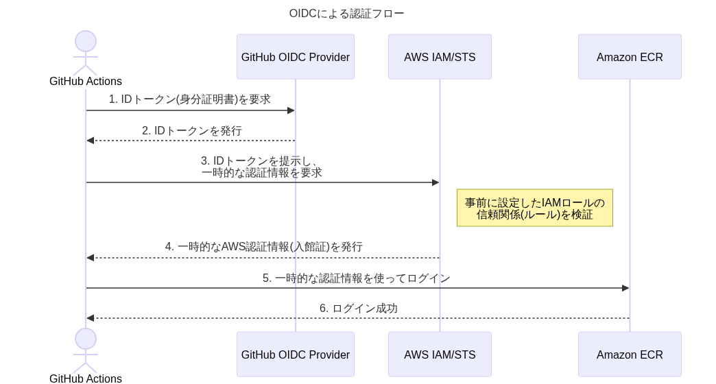 この仕組みにより、パスワードのような固定の認証情報(恒久的なキー)をGitHubに保存する必要がなくなり、安全性が飛躍的に向上します。実際の流れを図にすると、以下のようになります。