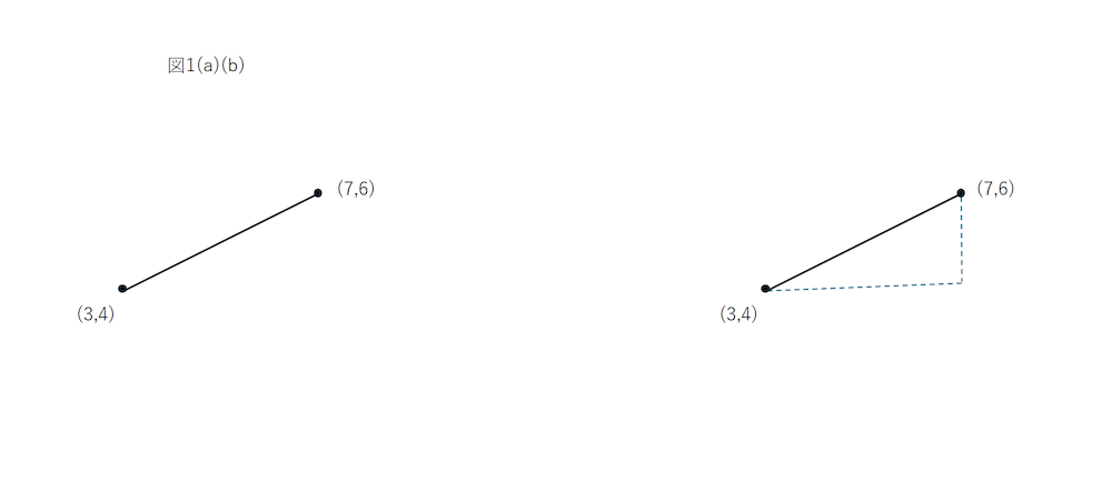 例えば、座標(3,4)と(7,6)の間の距離(図1(a))を知りたければ、ピタゴラスの定理を使って、次のような数式で計算できます。