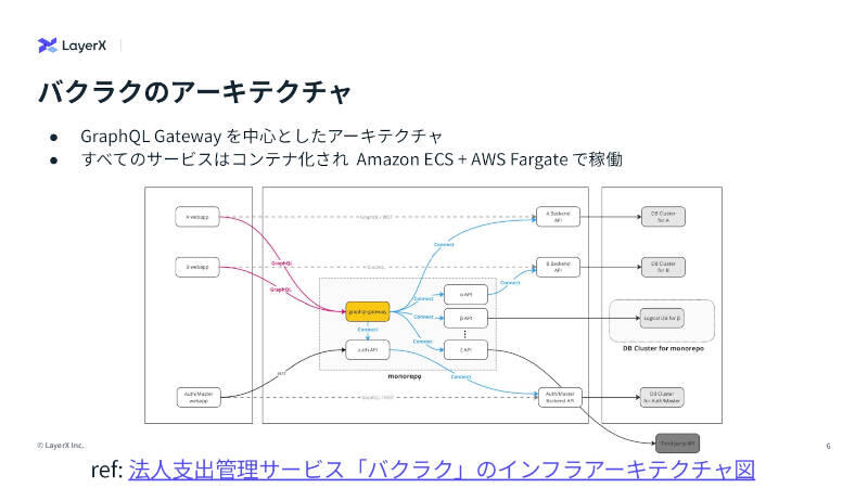 バクラクの各サービスはGraphQL Gatewayを中心に、ECS/Fargate などクラウド標準のアーキテクチャ上で稼働しており、この基盤を前提に統制やセキュリティをコードとして組み込む取り組みが進められている。