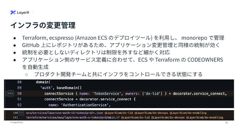 またインフラについても同じ考え方を適用し、Terraformやecspressoを用いてコード化した上で、GitHubで管理している。サービス定義から自動的にCODEOWNERSを生成し、責任の所在を明確化する仕組みを導入している。データベースについてはBytebaseを活用し、変更をレビュー、承認プロセスに組み込み、複製DBで事前検証を行うことで安全性を確保している。これらにより、アプリケーションからインフラ、データベースまで一貫した変更管理が実現されている。