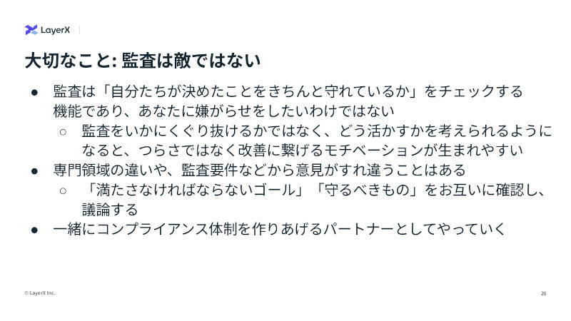 セッションの結びとして、星氏は監査との向き合い方に言及した。監査は開発者や運用担当者の活動を制約する存在ではなく、組織が決めたルールや仕組みがきちんと機能しているかを確認するための手段であると強調した。「監査は敵ではありません。決めたことを守れているかを確認し、改善のきっかけを与えてくれる存在なのです」と語り、その姿勢を会場に伝えた。さらに星氏は「監査をくぐり抜けるのではなく、うまく付き合って自分たちの仕組みを良くしていくチャンスにしたいと思っています」と語り、受け身ではなく前向きに監査を捉える姿勢を示した。