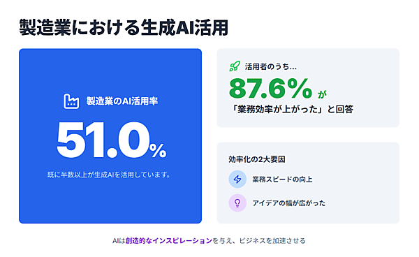 驚くべきことに、製造業の51.0%が既に、生成AIを活用しています。そして活用者の87.6%、実に9割近くが「業務効率が上がった」と回答。「業務スピードの向上」と並んで「アイデアの幅が広がった」という声が最も多く、AIが単なる作業代替ではなく、創造的なインスピレーションを与えていることが分かります。