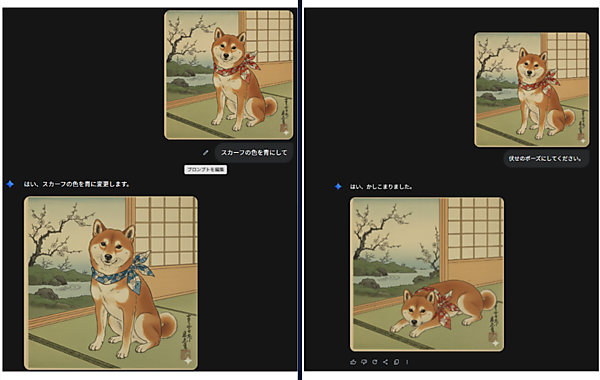 会話をするように段階的に画像を修正できる「対話型編集」に対応しています。例えば、「まず壁を青くして」「次に本棚を追加して」といった指示が可能です。
