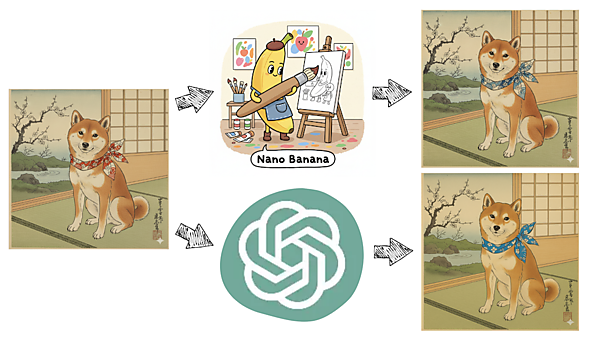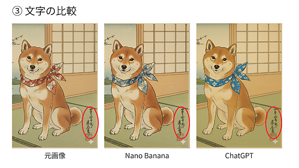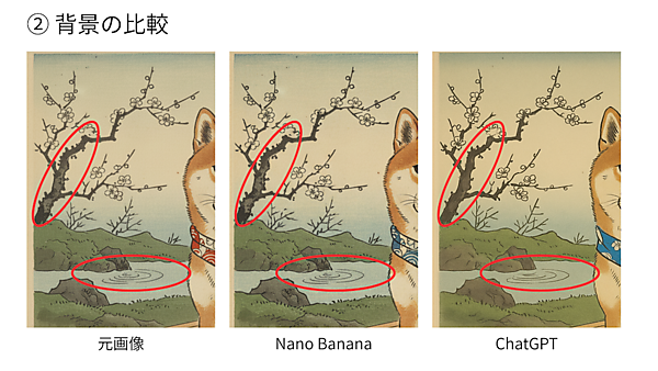 NanoBananaの方がChatGPTに比べ、指示されたポイント以外の変化がしにくいことが分かった。